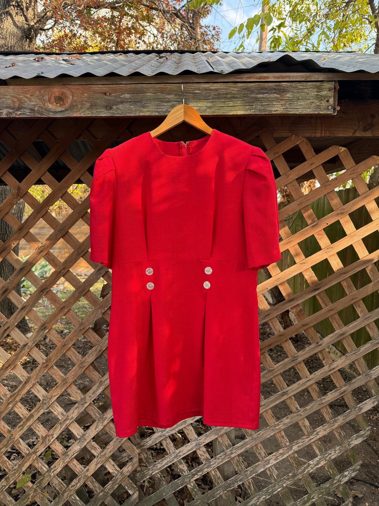 Best fits size large. Features 4 faux buttons along the waistline and a back zipper closure. Reworked into a mini length with a finished hem.
