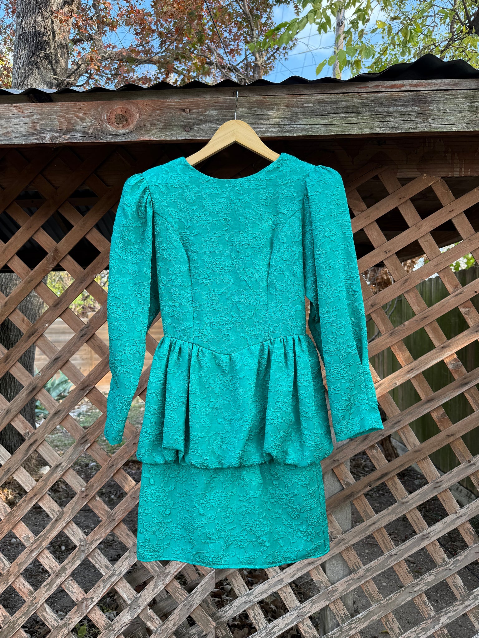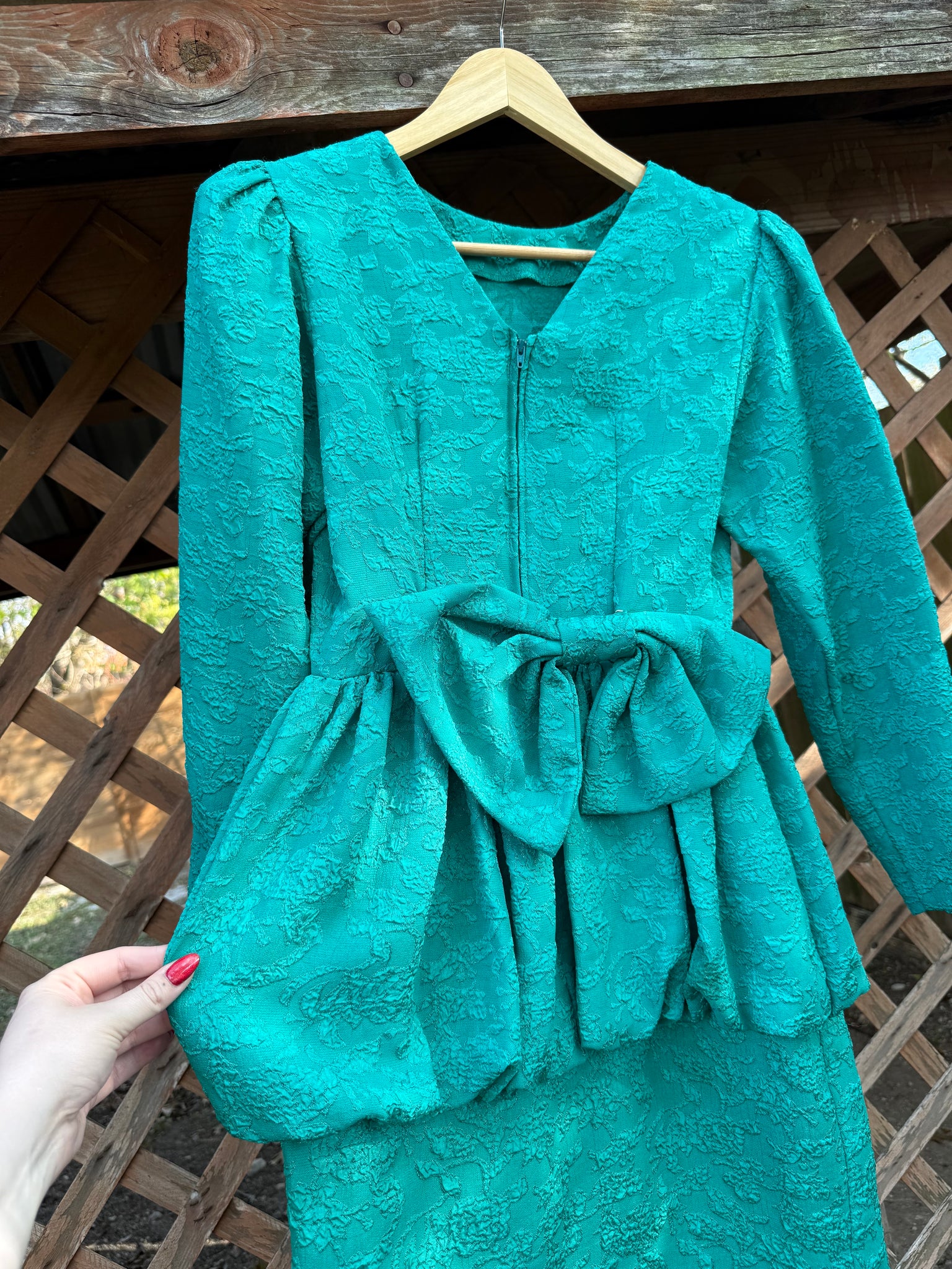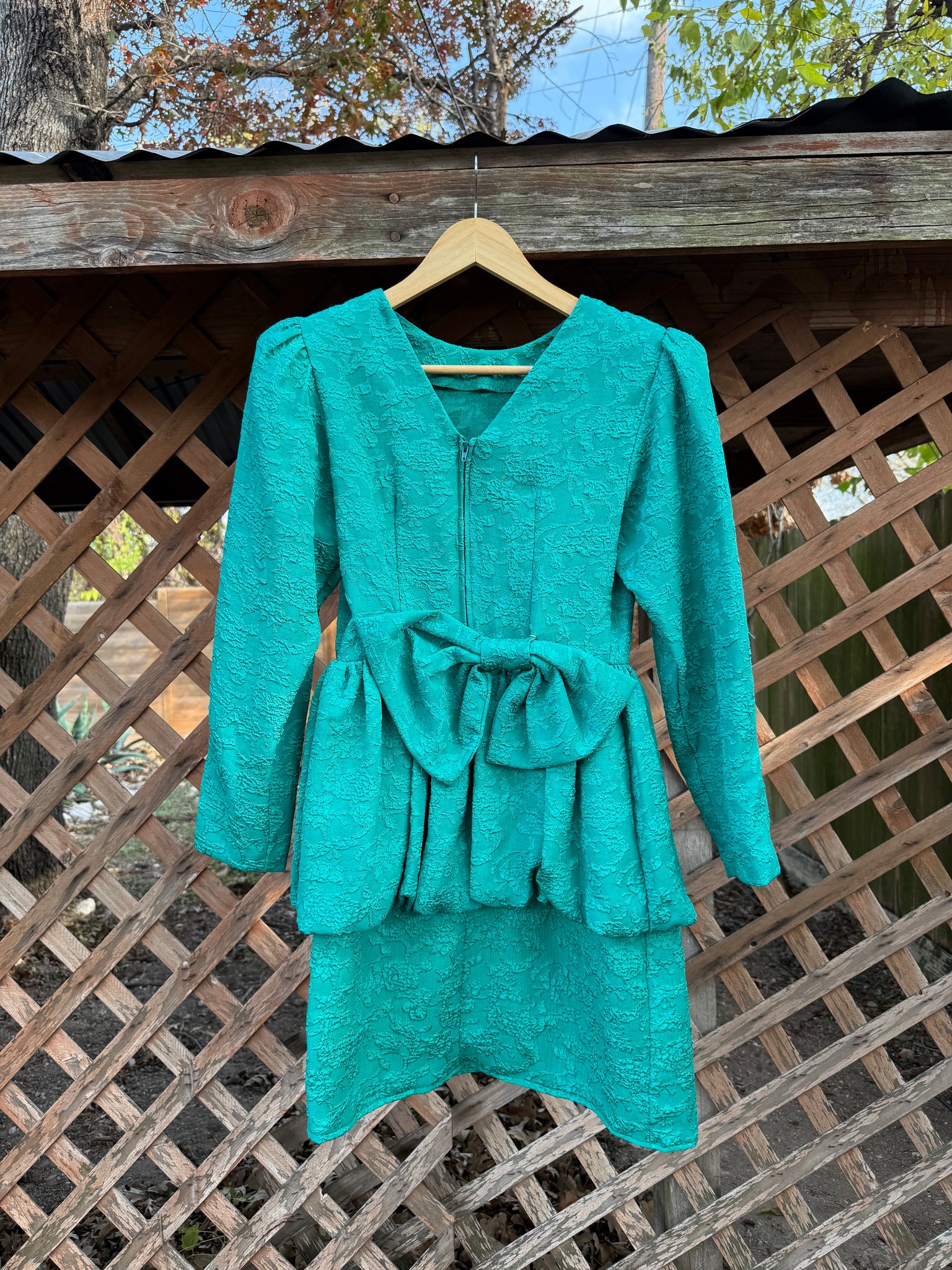 Best fits size small. Features a chunky bow and a back zipper closure. Reworked into a mini length with a finished hem.
