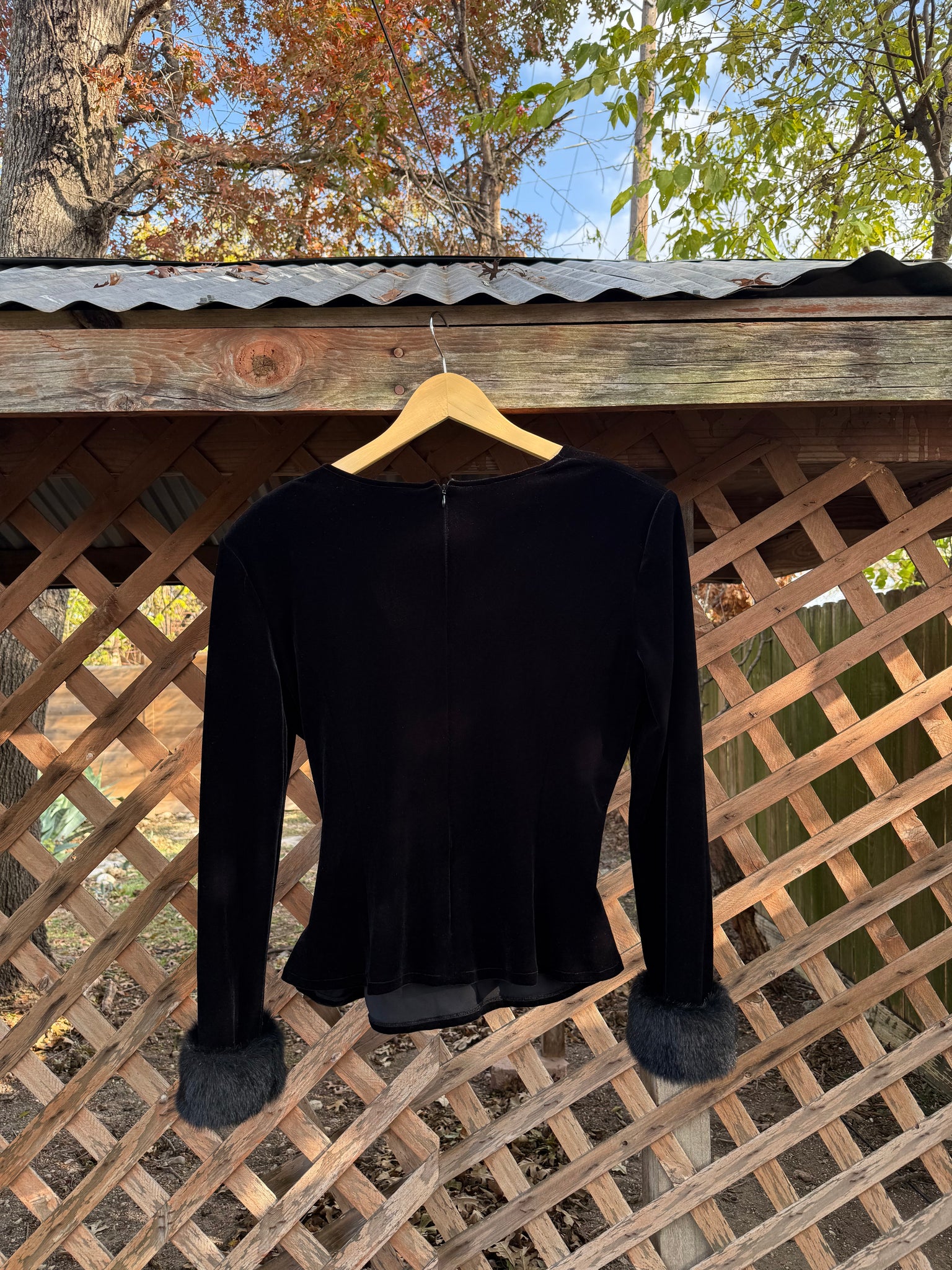 Best fits size medium. Features subtle shoulder pads, faux fur wrist detailing, and a back zipper closure. Fabric has some stretch. Made in the USA!