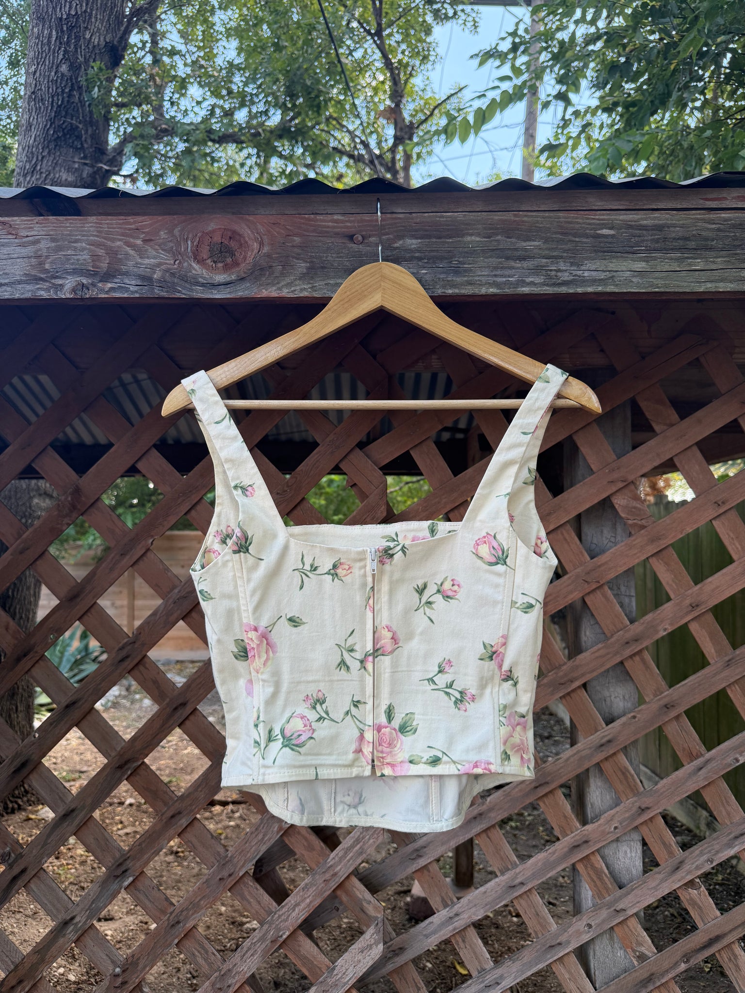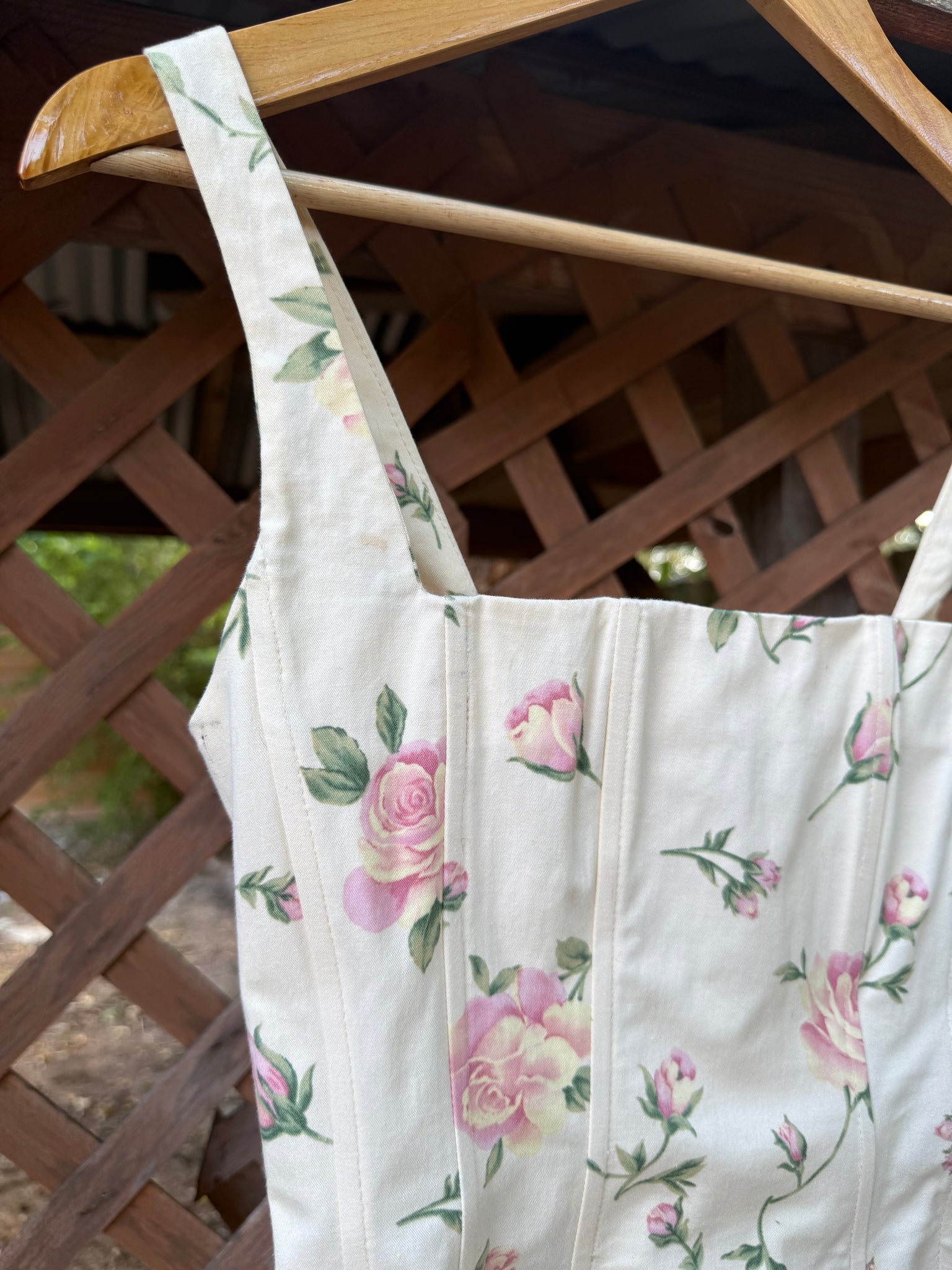 Best fits size xsmall/small. Features boning in the front and a back zipper closure. A few small spots of discoloration reflected in the price.